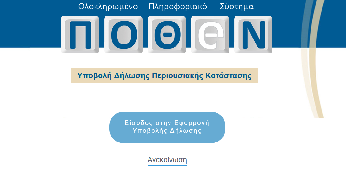Οι Δηλώσεις Περιουσιακής Κατάστασης (Δ.Π.Κ.) και Οικονομικών Συμφερόντων (Δ.Ο.Σ.), όλων των υπόχρεων, προς όλα τα όργανα ελέγχου του ν. 5026/2023, όπως τροποποιήθηκε και ισχύει, υποβάλλονται αποκλειστικά ηλεκτρονικά, με την αξιοποίηση της διαλειτουργικότητας μέσω της ενιαίας διαδικτυακής εφαρμογής (www.pothen.gr)