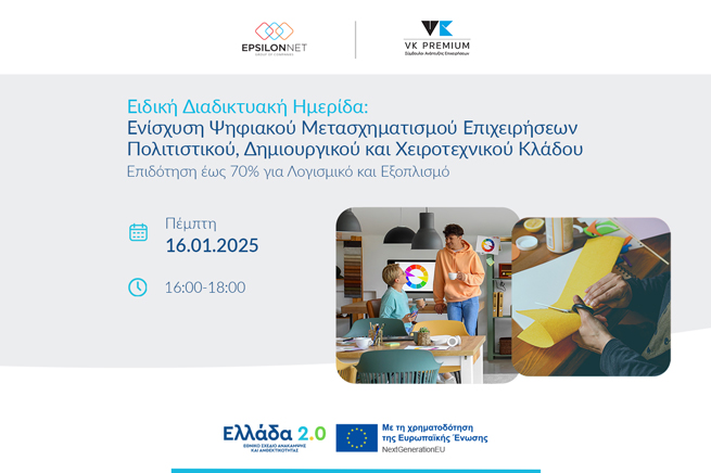 Ημερίδα από την EPSILON NET και την VK PREMIUM για το πρόγραμμα Στήριξης Ψηφιακού Μετασχηματισμού επιχειρήσεων του πολιτιστικού, δημιουργικού & χειροτεχνικού κλάδου